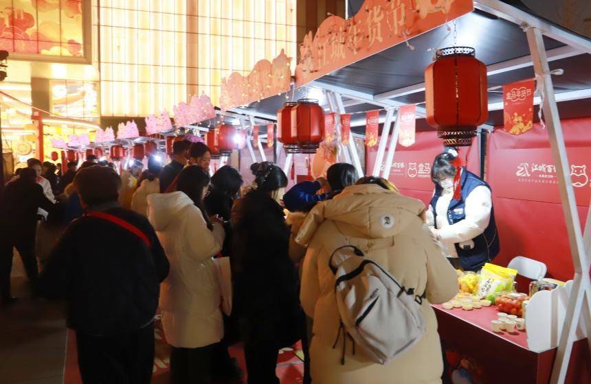 红灯笼下,洪山菜薹鲜嫩欲滴,糖画艺人指尖流转金丝,市民们拎着沉甸甸的年货穿行在摊位间,笑声与叫卖声交织成腊月里最热闹的市井交响。现场还设有非遗体验项目,增添了浓厚的文化氛围。